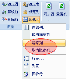 在“日常工作”功能区的“数据”功能组,单击“其他”按钮,出现的下拉菜单中,有隐藏列和取消隐藏列的命令: