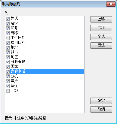 可以看到,这个窗口不仅可以选择要显示的列,还可以调整列的显示位置。 显然,如果要隐藏多列,而且是非连续的,用取消隐藏列窗口更方便。