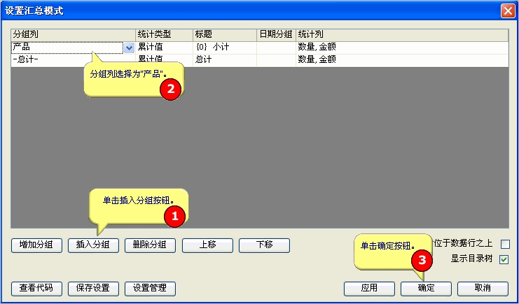 上一节只是加入了总计行,如果你还希望根据产品分组,累计每一个产品的销售数量和金额,可以再次单击“设置汇总模式”按钮,之后按下图所示操作: