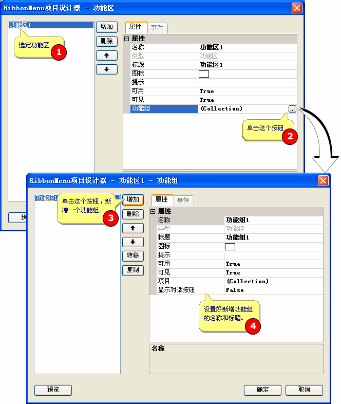 选择要增加功能组的功能区,单击属性页“功能组”项目右侧的按钮,出现功能组管理窗口,单击“增加”按钮,增加一个功能组,在属性页设置好新增功能组的名称和标题。