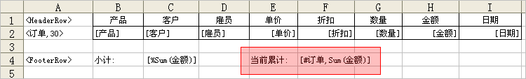 假定我们不仅要汇总出每一页的小计,而且需要得截止到当前页为止的累计,可以按下图所示设计报表模板: