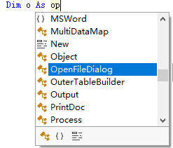 自动完成列表会自动定位到第一个以"op"开头的类型,也就是"OpenFileDialog":