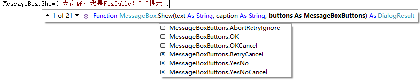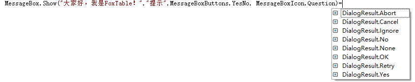 MessageBox.Show("大家好,我是FoxTable!","提示",MessageBoxButtons.YesNo,)