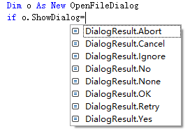 现在自动完成列表会列出DialogResult的全部成员供选择: