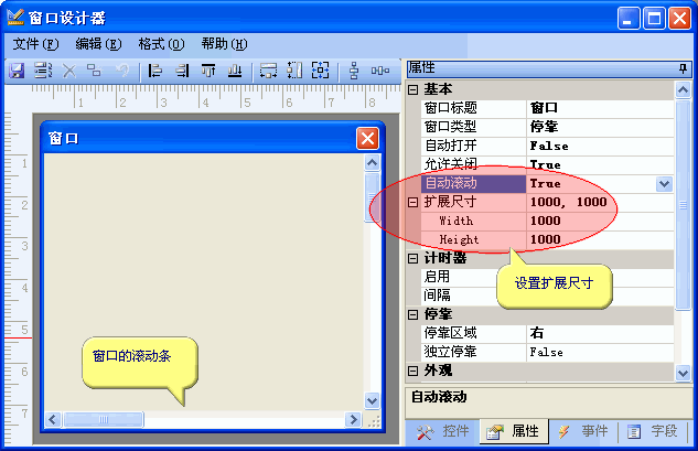 另外如果将“自动滚动”属性设为True,当窗口中的控件位置或大小超出窗口范围时,将自动出现滚动条,不管是否设置了扩展尺寸。