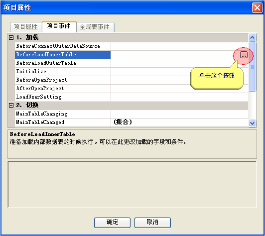 客户三个表初始不加载任何数据,首先打开项目属性设置窗口,选择项目事件页,单击BeforeLoadInnerTable事件旁的按钮"...":