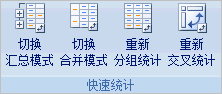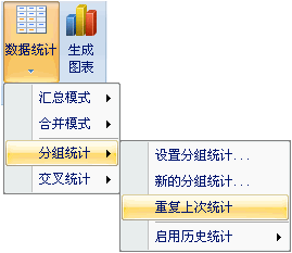 如果你的屏幕分辨率低于1280,则不会出现“快速统计”功能组,不过你仍然可以使用快速统计功能,不过要多按两次鼠标;例如要根据上次设置,重新生成分组统计表,只能执行下图所示的菜单命令:
