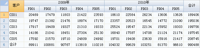 例如下图统计的是不同客户在每年订购各种产品的数量,有两个垂直分组,分别是年和产品: