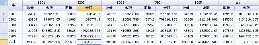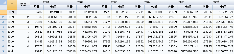 交叉统计也可以同时对多列进行统计,例如下图按季度统计不同产品的销售数量和金额: