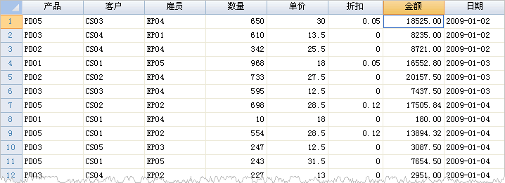 除常规的数据列外,你还可以增加表达式列,表达式列可以设置计算公式,其内容由其它列计算得出。 例如下面的订单表,其金额列就是一个表达式列,其计算公式为:数量 * 单价 * (1 - 折扣),这样只要输入数量、单价和折扣,金额即可自动计算得出: