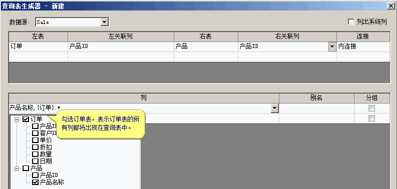如果查询表要包括某个数据表的所有列,那么无需逐列勾选,直接勾选此表即可。