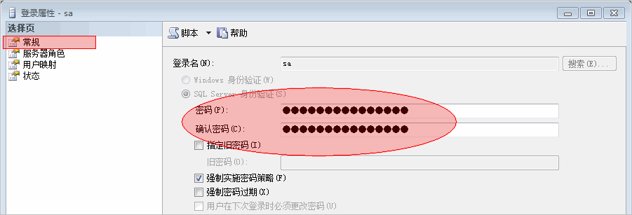 3、回到对象资源管理器,在节点“安全性 → 登录名”下右击登录名“sa”,从快捷菜单中执行“属性”: