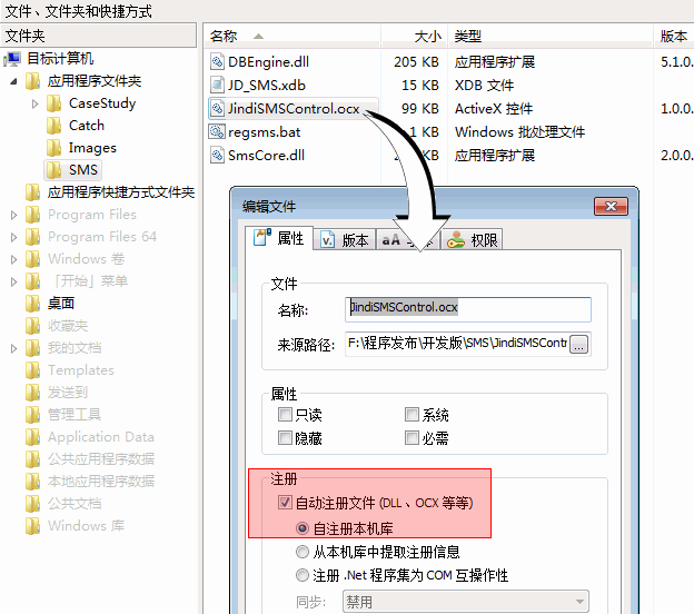 如果要制作安装程序,在应用程序文件夹中,选择SMS文件夹,右击文件JindiSMSControl.ocx,从快捷菜单中执行“属性”,在属性设置中选中选项“自动注册文件”: