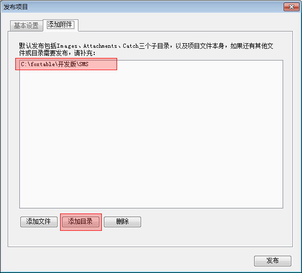 短信收发模块的文件,位于Foxtable安装目录的SMS目录下,发布项目的时候,可以在"添加附件"页,单击"添加目录"按钮,将SMS目录添加进来。