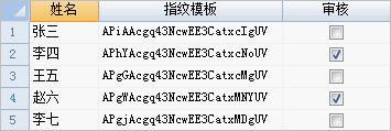 1、首先设计一个用户表,包括三列,分别是姓名、指纹模版、审核,其中审核列是个逻辑列,用于标记某个用户是否有审核权限: