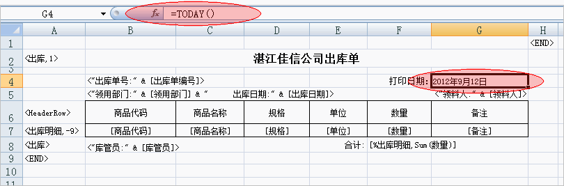 例如在设计出库单模版的时候,打印日期需要调用当天的日期,可以直接将这个单元格的公式设置为: =Today()