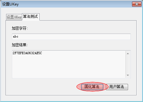 3、在设置窗口中选择“算法测试”页,输入要加密的字符,然后单击“固化算法”按钮,得到加密结果: