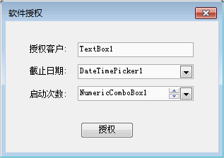 2、然后你单独建立一个项目,在这个项目中设计一个UKey授权窗口,用于输入授权用户、截止日期和允许启动次数: