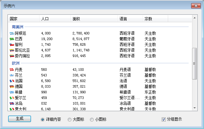 本节的目的是设计一个下图所示的窗口,ListView从数据表中提取数据,并用分组的形式显示各国 的详细信息: