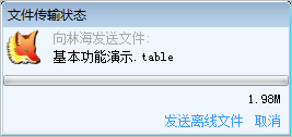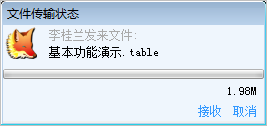 发送方在内置聊天窗口,单击单击“发送文件”按钮,选择要发送的文件后, 屏幕右下角出现下图所示的窗口: