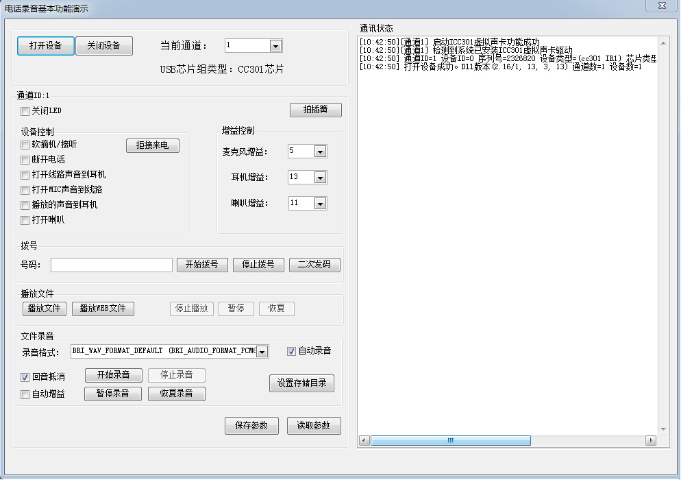 示例设计了一个窗口(电话录音基本功能演示)来进行设备的控制操作。
