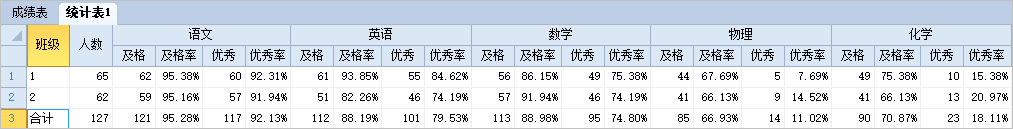 希望按班级统计每科的及格人数、及格率、优秀人数和优秀率: