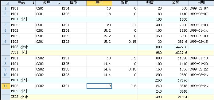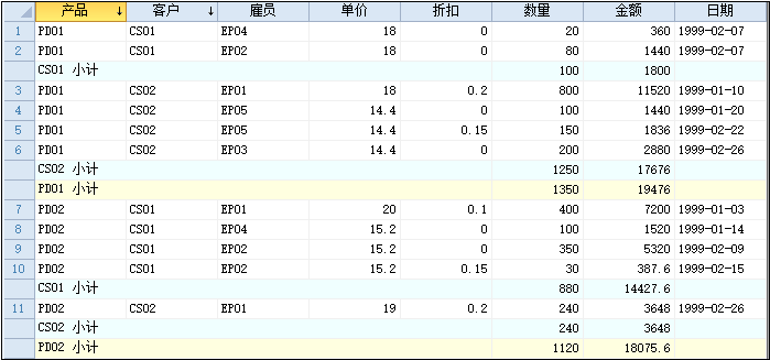 假定要通过汇总模式,统计每个产品不同客户的采购的数量和金额,以及每个产品总的销售数量和金额,只需根据客户和产品分组,对数量和金额进行统计即可。