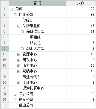 折叠模式还可以进行数据汇总,例如下图的折叠模式,汇总出了每个部门的员工人数: