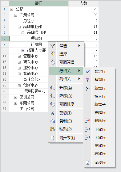 在折叠模式下,除了原有的增加、删除、插入和克隆行,还可以增加子行,还可以通过上下左右移动行来调整行的从属关系,当然你还可以编辑数据: