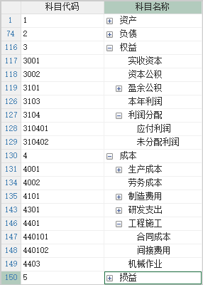 在折叠模式下,所有的行(包括分组行)都是普通的数据行,折叠模式只是按照从属关系临时调整了一下行的位置,如果某行有子行,则会在该行位置显示一个符号"+"或符号"-",用于展开或折叠子行。