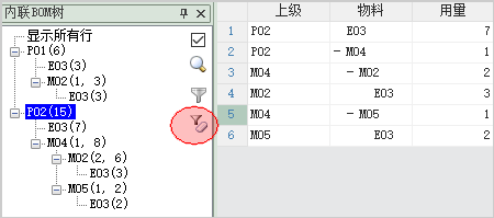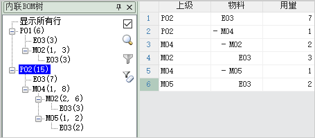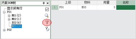 当BOM树处于节点筛选状态时,单击某个节点,数据表只会显示和被筛选节点相关的行,例如单击PD02节点,只会显示和E03相关的6行数据: