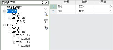 4、现在BOM树将只显示和E03相关的节点,并自动汇总出每个节点使用的E03数量,例如P01合计使用了6个E03,其中直接使用量是3个,另外通过下属中间件M01使用了3个。
