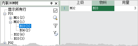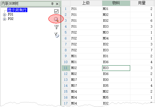 在BOM树中单击某个节点,可以筛选出此节点用到的全部物料(行)。 反过来,我们在表中浏览到某行数据的时候,也能在BOM树中找出此行数据对应的节点,并选定之。 例如在下图中,想查看当前行在BOM树种对应的节点,只需单击"定位节点"按钮: