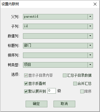 3、在菜单中执行"设置内联树"命令,按下图所示设置 内联树,树类型选择"项目"或"BOM",父列和子列分别选择"parentid"和"id",标题列设置为"部门":