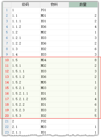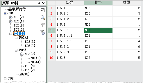 和上一节的内联BOM树不同,现在这些行都是新增加的,单击节点"显示所有行",你会发现为了支持这个新增的M04节点,系统自动增加了多大11行的数据,而且级码、物料和数量三列的内容,都已经自动输入了: