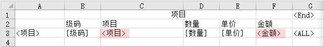3、我们已经在Attachments目录下设计了一个报表模板,名称为"折叠模式.xls",格式为如下,注意金额和项目用的是尖括号,而不是方括号,原因参考:使用标记