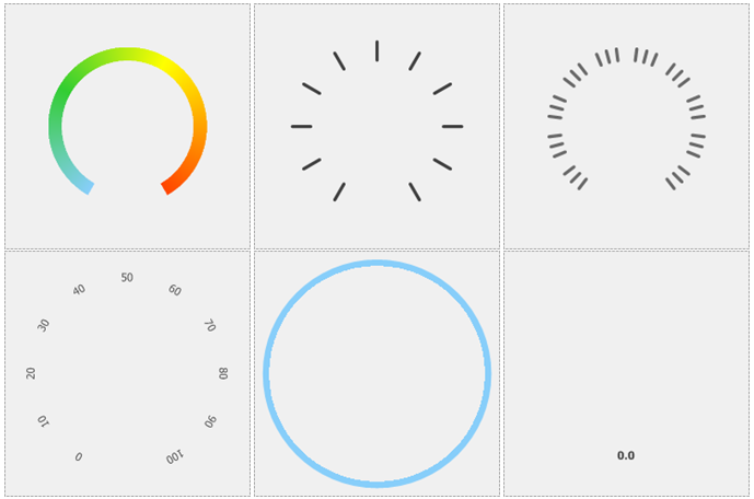 分别是一个Range(范围),两个Mark(主刻度和次刻度),一个Label(标签),一个SingleMark(状态标记),和一个显示当前值的SingleLabel(单标签):