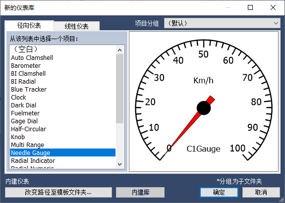 1、可以在窗口设计器中增加一个Gauges控件,在控件的属性窗口找到"Gauges"属性,单击右侧的"..."按钮,打开Gauges集合编辑窗口,在径向仪表的默认分组中,可以找到 上述两个仪表: