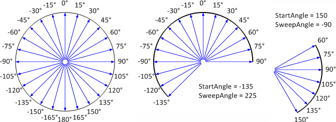 SweepAngle: | 扫描角范围度数,顺时钟为正,逆时针为负,通过"StartAngle + SweepAngle"计算得出的角度,就是值为Maximum时的角度位置。 |