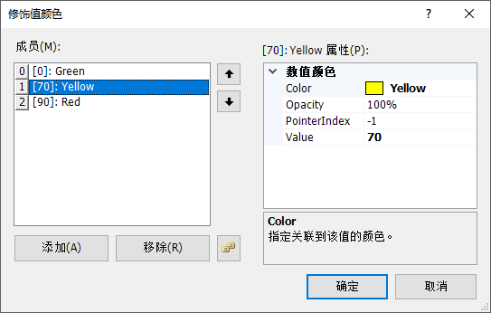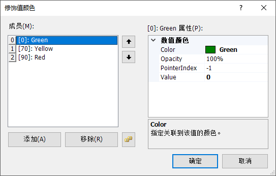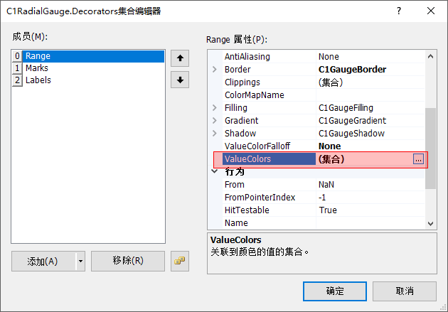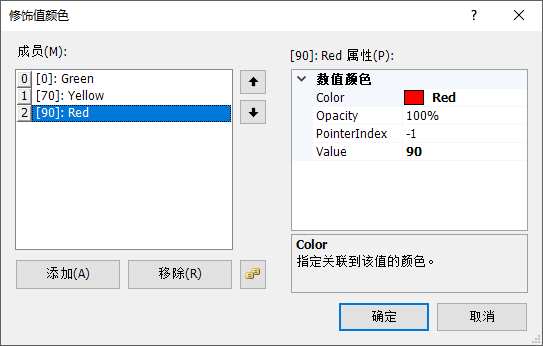 2、增加三个ValueColor,其设置如下图, 注意ValueColor的Value属性,其实就是一个起点值,也就是从这个值开始,用指定的颜色填充Range