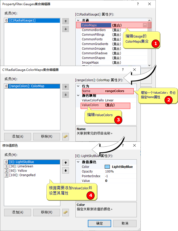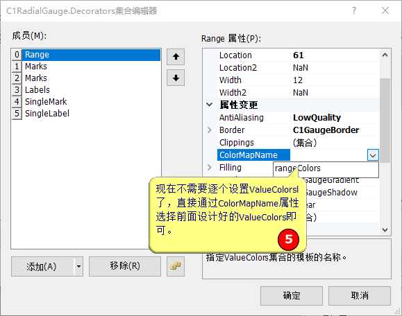 所有的Decorator(装饰件)都有ValueColors属性,都可以用不同的颜色显示不同范围的值。