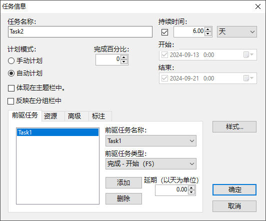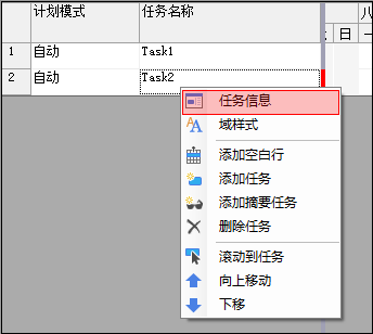 通过这个快捷菜单,你还可以增加任务,删除任务或上下移动任务,如果执行"滚动到任务"命令,会自动滚动右边的任务条窗口,使得该任务的任务条可见。