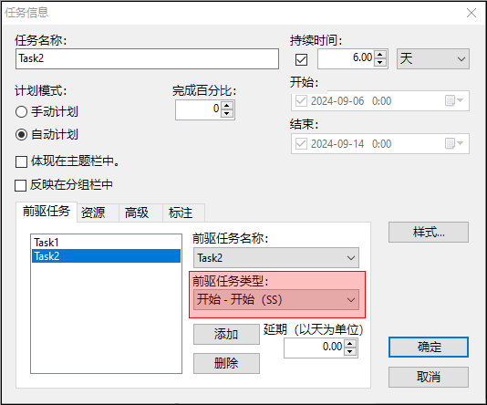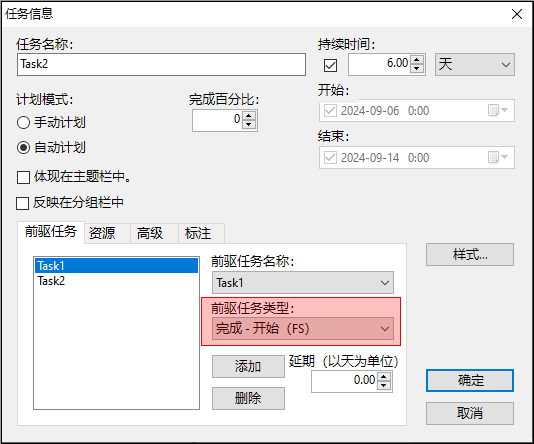 通过拖动创建的前驱任务(链接),默认类型是"结束-开始"。