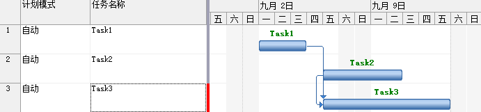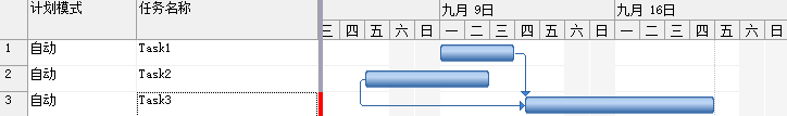 现在通过拖动Task1的任务条,将其开始日期改为9月9日,可以看到Taksk3的开始日期被系统自动调整为9月12日了,这就是使用自动任务和前驱任务的好处: