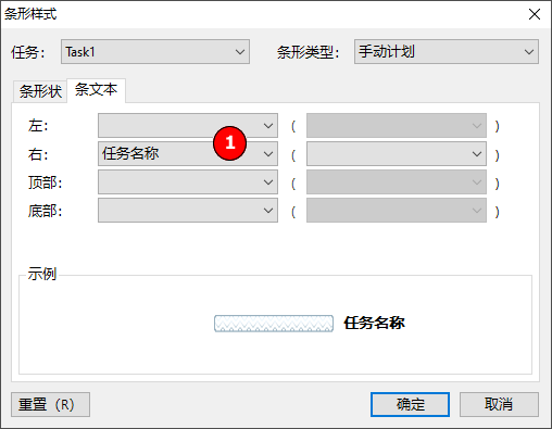 1、在任务条属性窗口中选择“条文本”页,在“右”下拉框中选择“任务名称”: