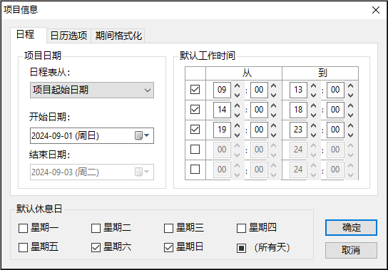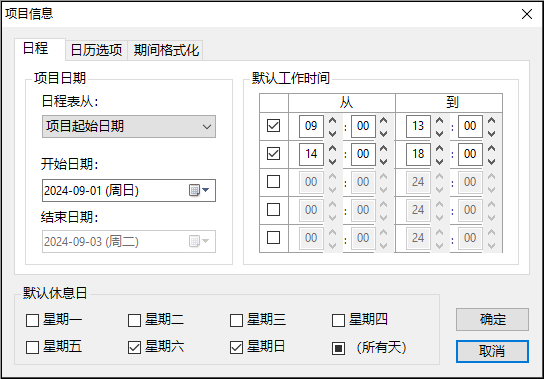 你可以修改默认工作时间,需要记住的是,如果你修改了工作时间,那么一定要在“日历选项”页面,将“每日小时数”改为正确的值,否则系统在计算结束时间的时候,会出现莫名其妙的错误。