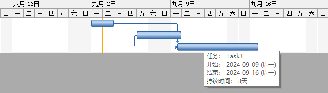 如果“日历选项”页面的“每日小时数”继续维持8小时,那么就会出现下图的情况,Task3持续时间应该是8个工作日,但是甘特图中任务条划过的工作日只有5个多点: