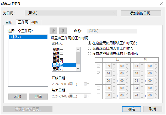 在工具栏中,单击"改变工作时间"按钮,在弹出的窗口中选择“工作周”页面,然后选择“星期五”:
