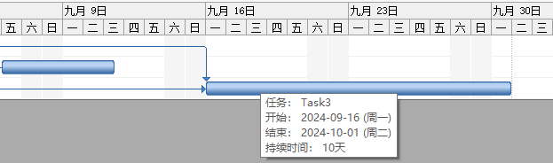 现在增加一个Task3,将其持续时间设置为10天,可以看到其任务条划过了11个工作日,因为周五只算半天: