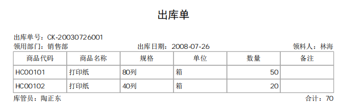 本节的任务是打印一个下图所示的出库单,同样的任务我们已经用Excel报表、Word报表和WordCreater实现过,现在尝试用PDFCreator实现:
